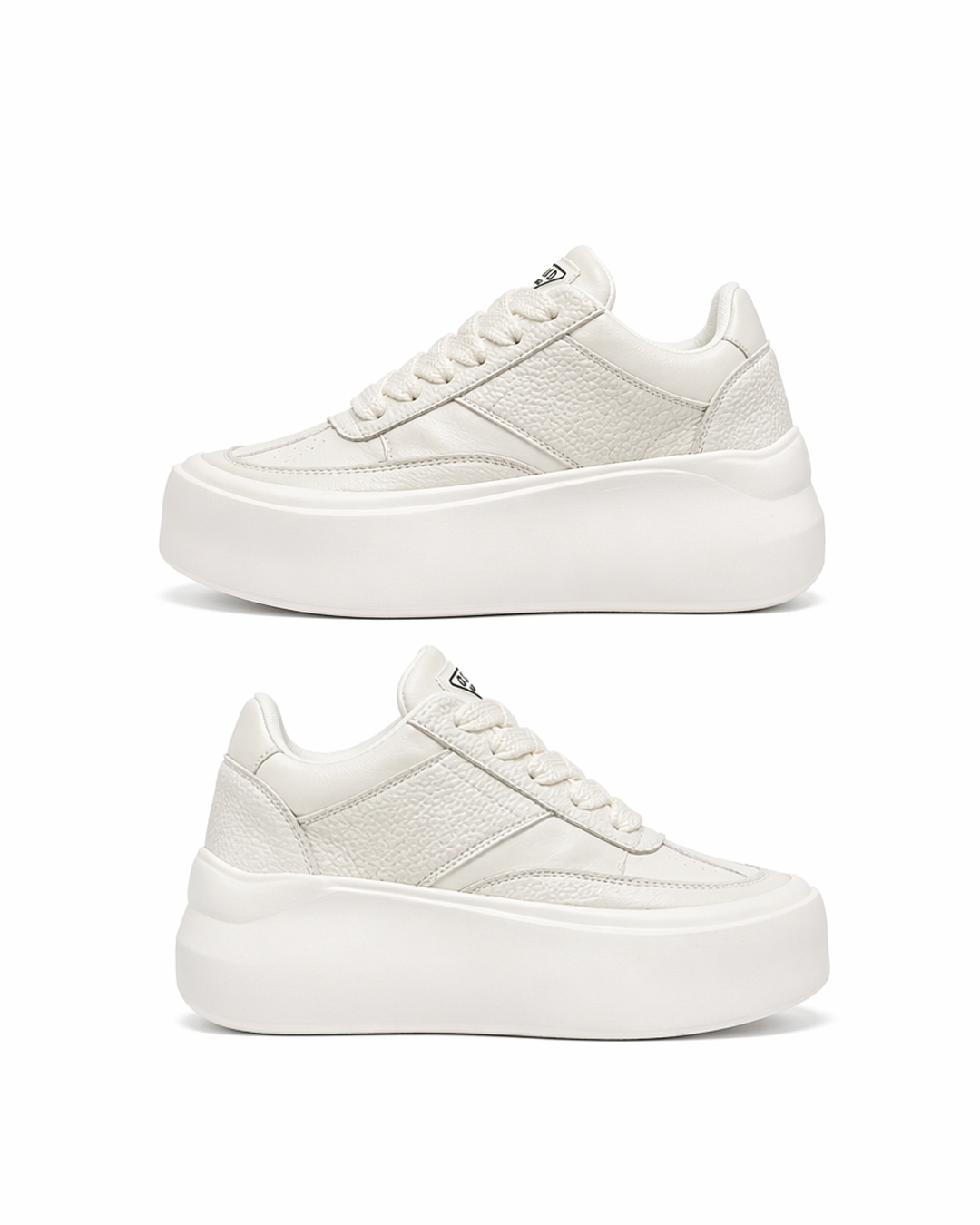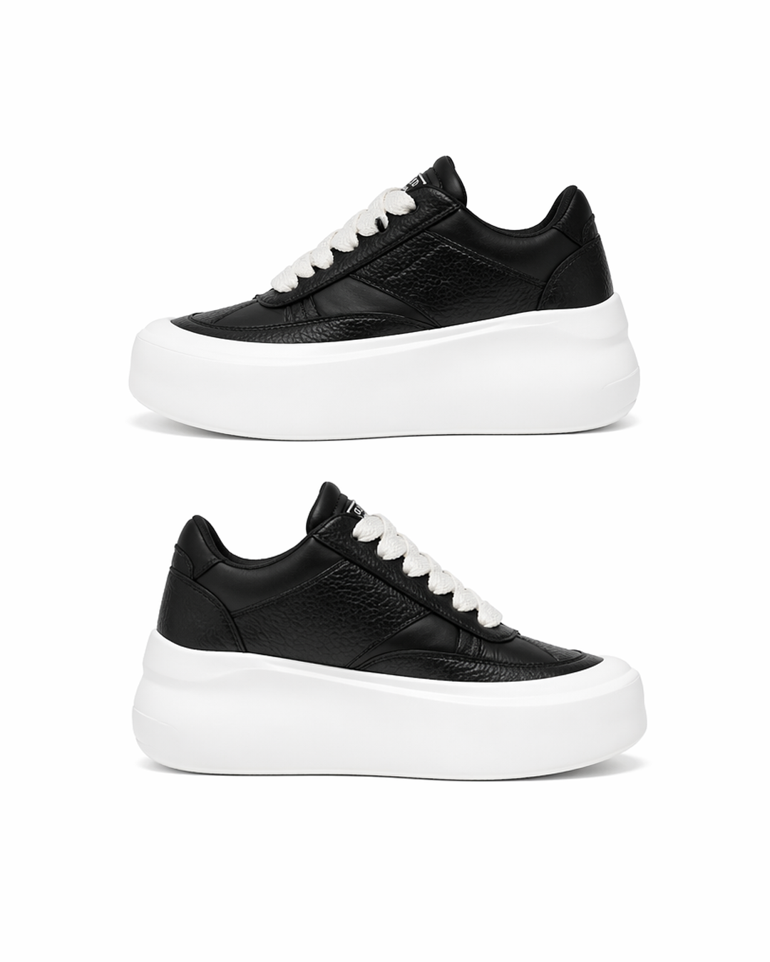 These modern low-top sneakers feature a bold platform sole and a clean lace-up design, offering a sleek, minimalist look in classic black and white that adds height and a stylish edge to everyday outfits.