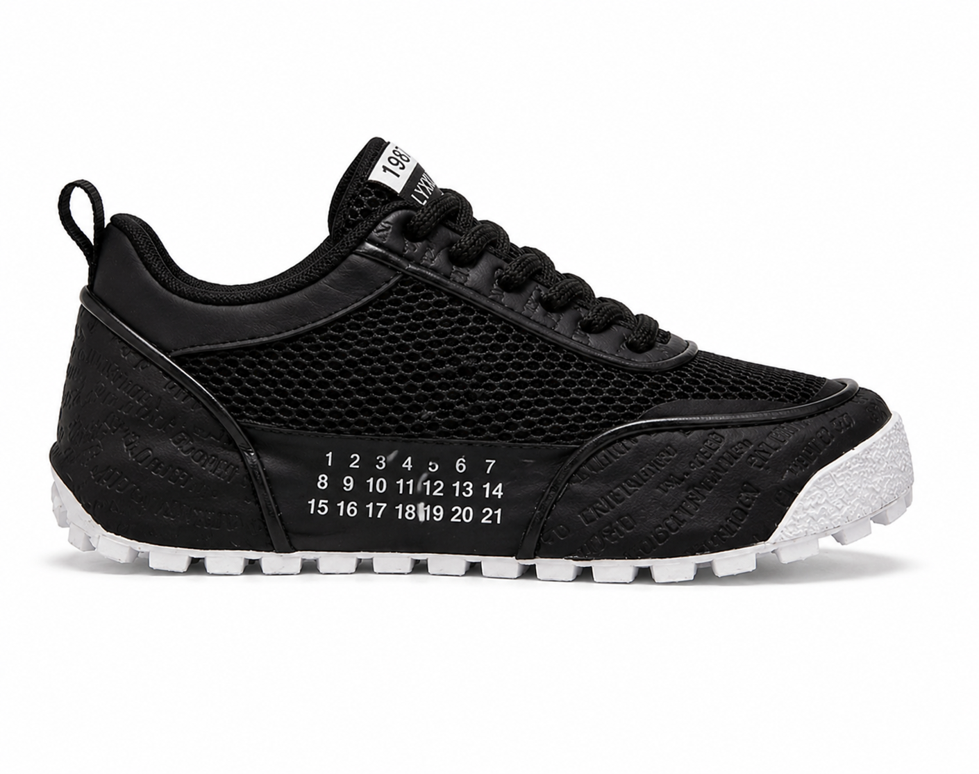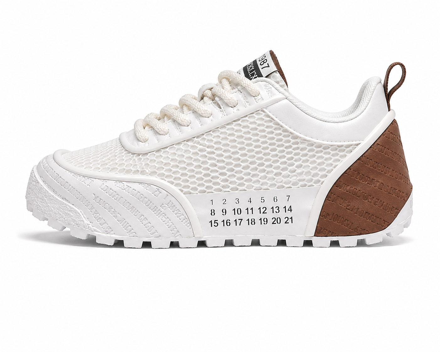 These sneakers feature a modern low-profile design with breathable mesh uppers, textured leather overlays, and distinctive numeric detailing along the sides, available in both sleek all-black and clean white with brown accents.