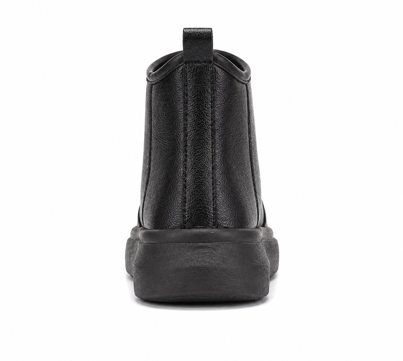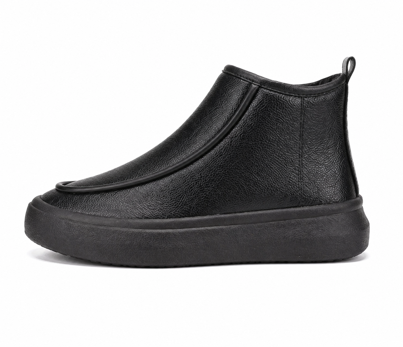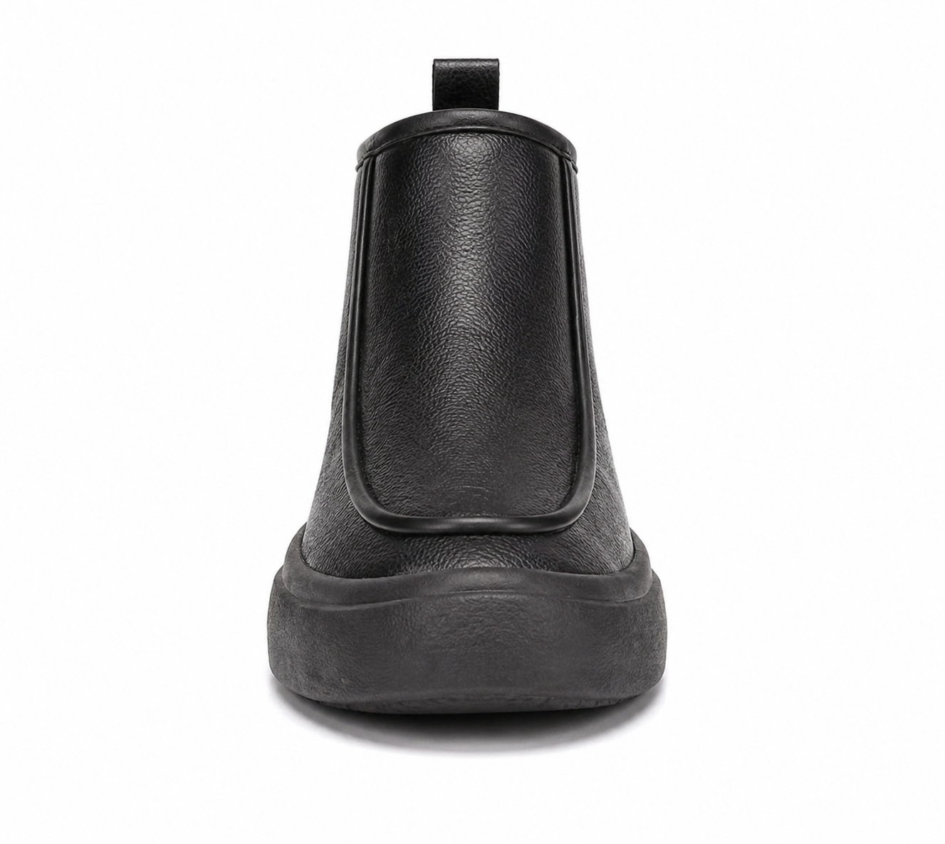 A sleek black slip-on ankle boot with a textured leather upper, minimalist stitching, and a thick, cushioned sole for a clean, modern look.