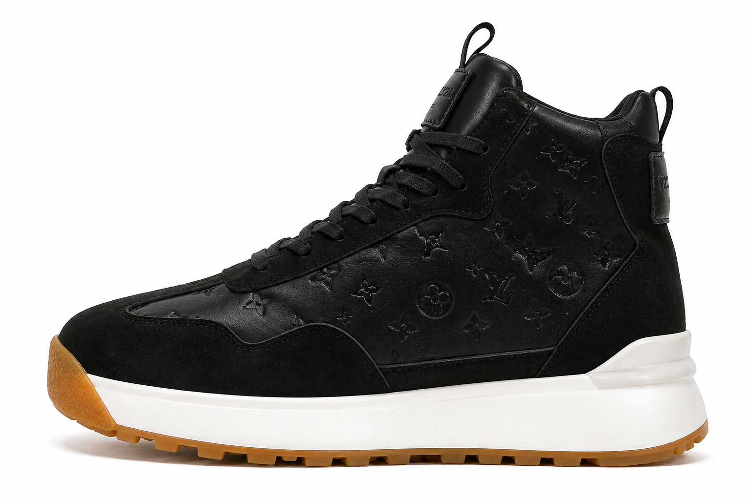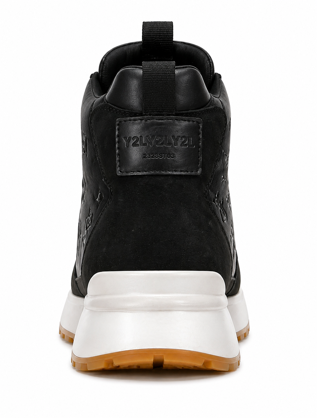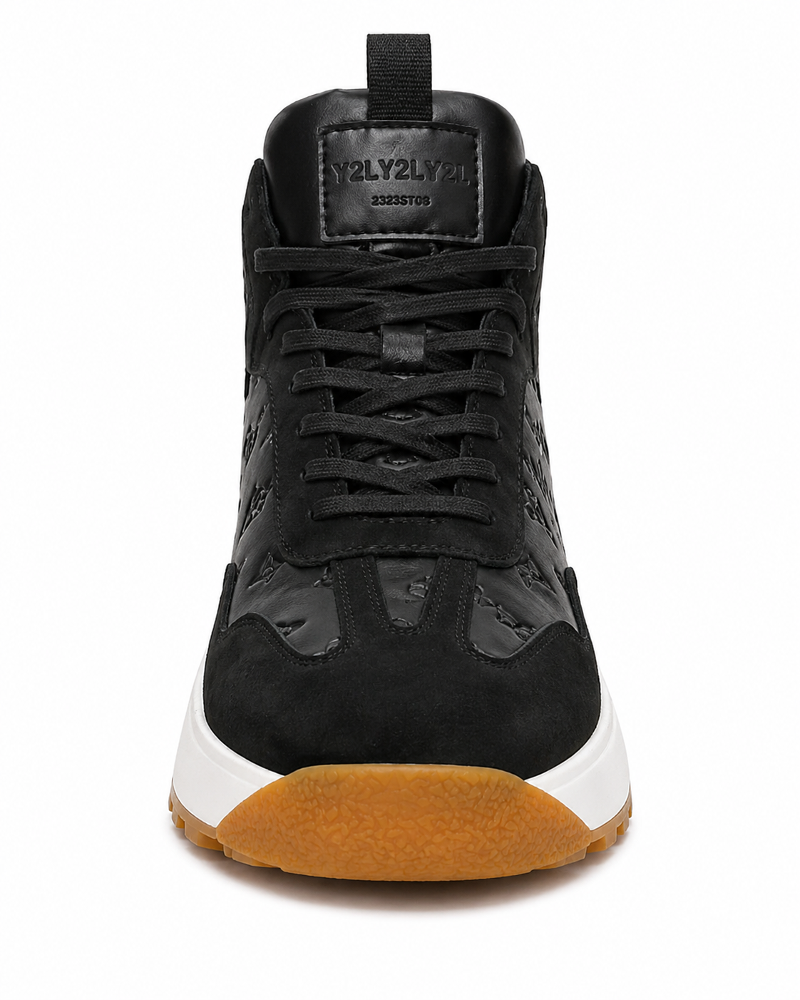 Two premium high-top sneakers—one in clean white and the other in deep black—feature embossed luxury patterns, suede overlays, and chunky white midsoles with gum outsoles, delivering a bold, modern, high-fashion streetwear aesthetic.