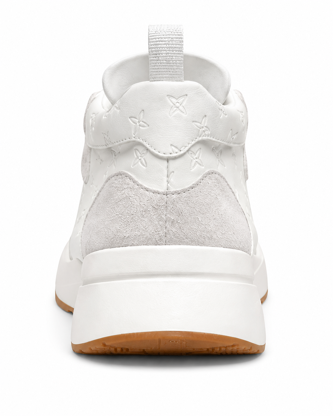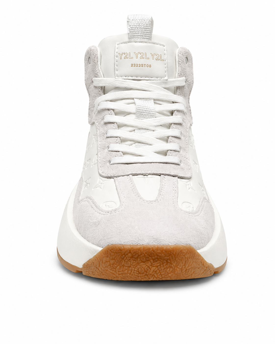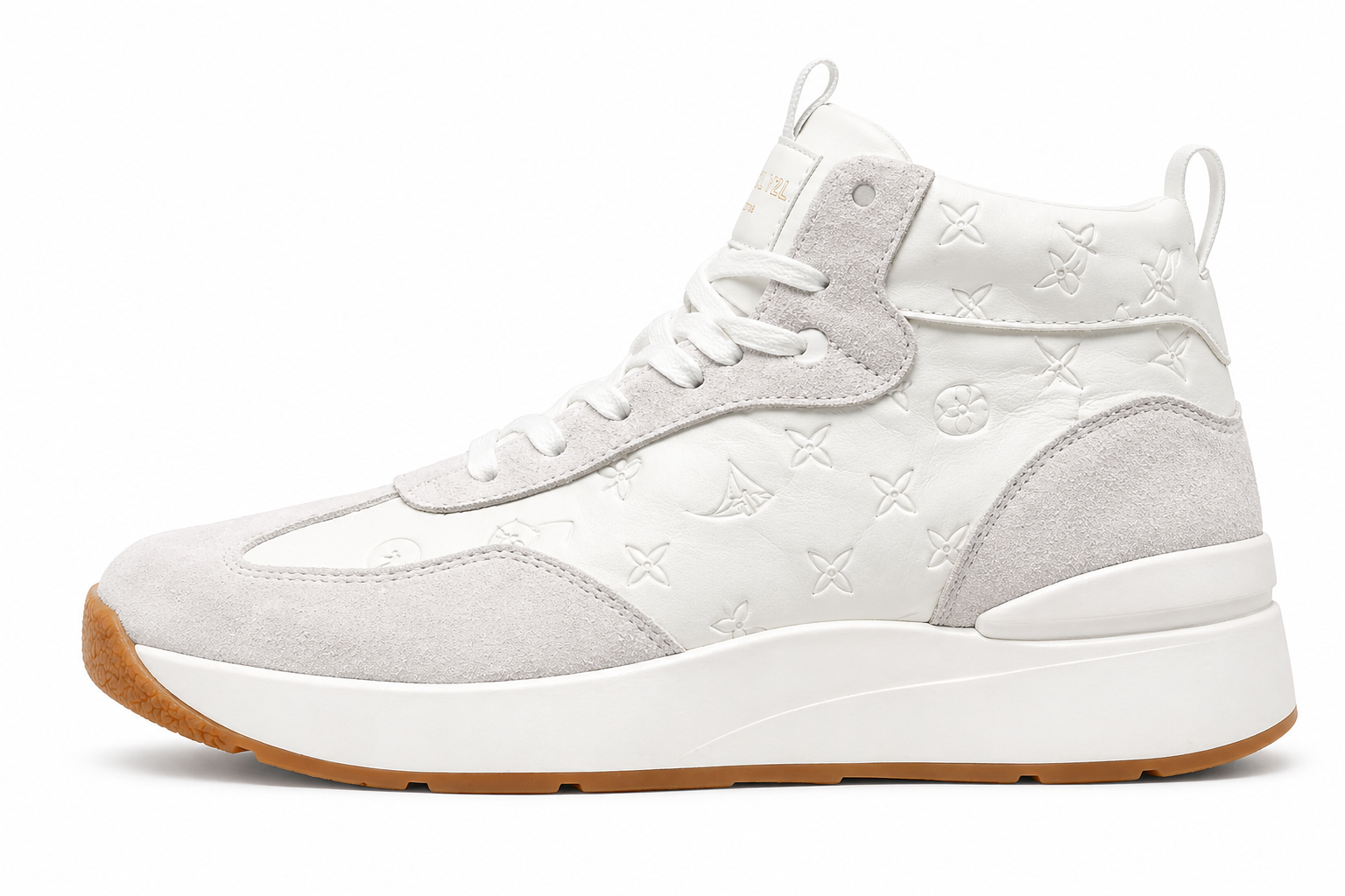 Two premium high-top sneakers—one in clean white and the other in deep black—feature embossed luxury patterns, suede overlays, and chunky white midsoles with gum outsoles, delivering a bold, modern, high-fashion streetwear aesthetic.